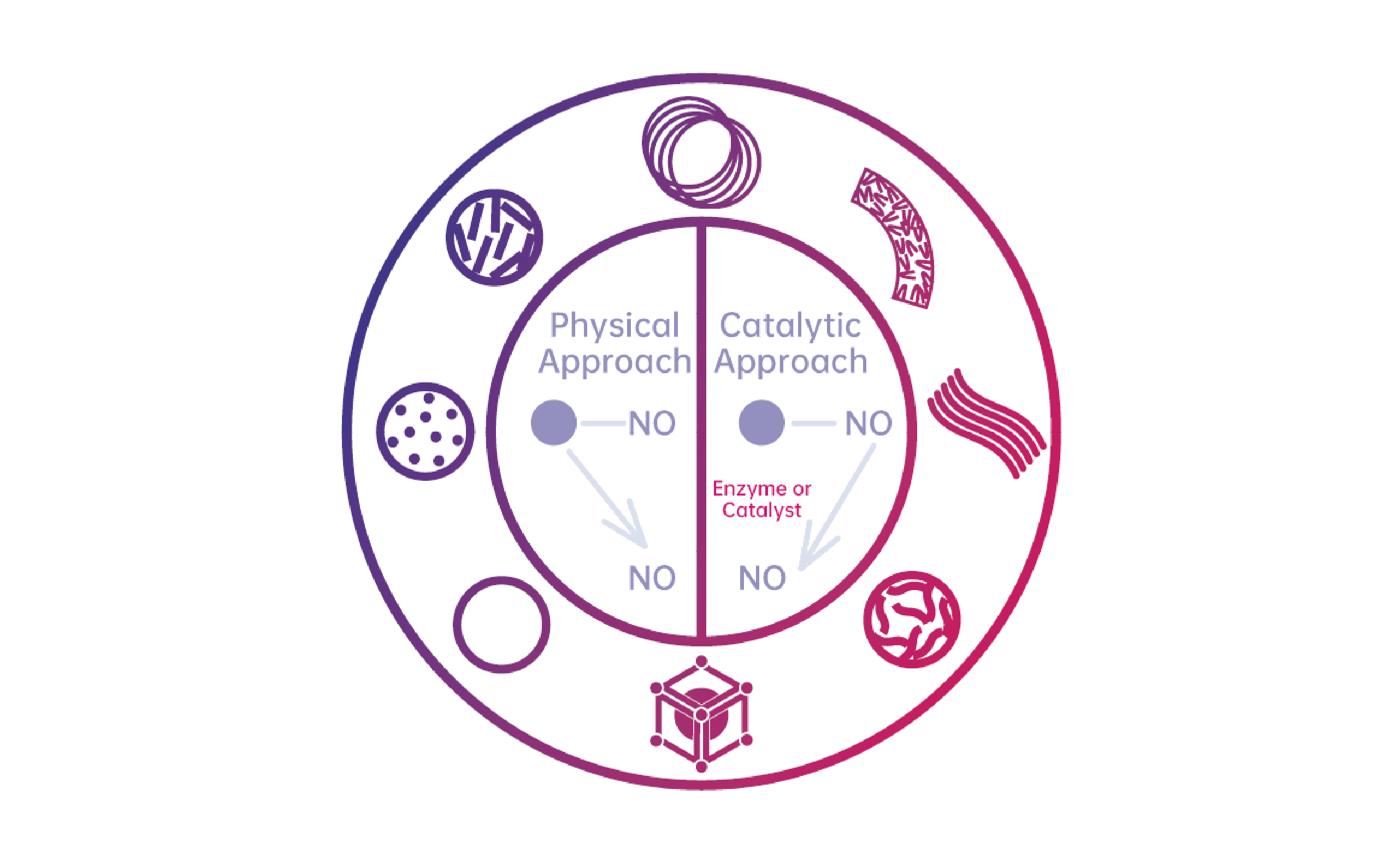 基于生物体内外扩张血管、抗菌抗病毒、工程组织再生、医美抗衰、疼痛管理、环境消杀等所需NO的作用时间和作用浓度不同需求,根据内源性、外源性NO气体分子释放机理及作用路径,设计合理对应的NO供体结构分子,确保其释放使用的精准可控、安全高效。